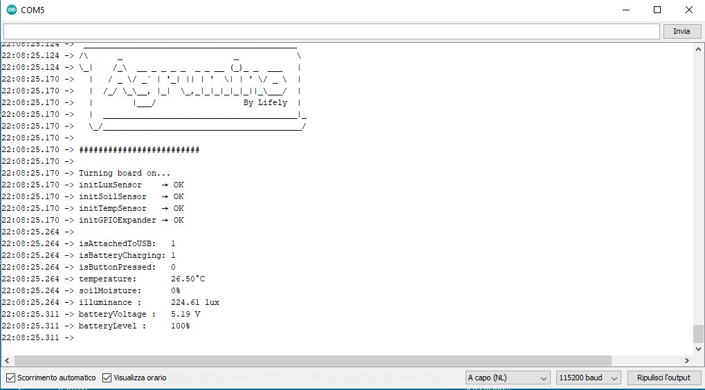A questo punto il led della scheda inizia a lampeggiare e dal monitor seriale impostato a 115200 baud è possibile leegere i valori di temperatura, umidità e luminosità misurati dai sensori della scheda: