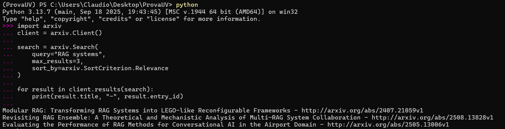 In questo articolo** spiegheremo cos’è un ambiente virtuale, come crearlo con lo strumento uv, e vedremo un esempio pratico con la libreria arXiv, che permette di cercare articoli scientifici dal famoso archivio online. Vedremo queste operazioni su Windows, ma su Ubuntu o su MacOs o su una qualsiasi distribuzione Linux le operazioni da fare sono simili.