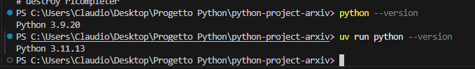 Da notare che, sul PC utilizzato, è necessario che siano installati Python e uv, ma che Python può avere una versione diversa da quella del progetto. Il Python richiesto dal progetto verrà installato all’interno dell’ambiente virtuale.