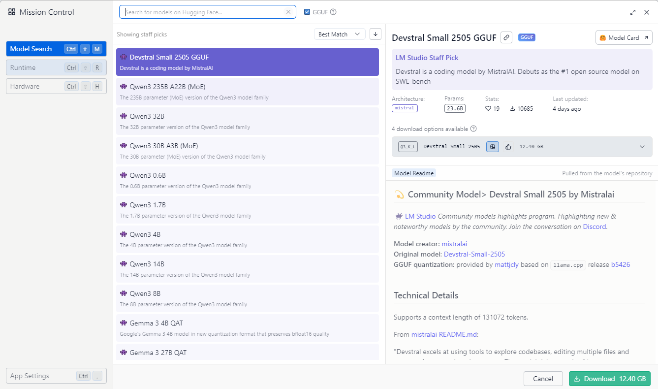 Per ogni modello presente nell’elenco, sono indicate varie informazioni: il nome, l tipo di architettura, il numero di parametri, il numero di download, i dettagli tecnici, la data di creazione e, soprattuto, se le risorse del proprio computer sono sufficienti ad eseguire quel modello.