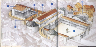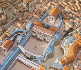 Con questo termine ai tempi dei Romani si indicava la piazza principale che costituiva il centro religioso, amministrativo, culturale e commerciale di una città. Era di solito di forma rettangolare, circondata da portici, e poteva includere all’interno del suo perimetro anche un tempio, un mercato, una basilica, una biblioteca o altri edifici pubblici. Al tempo col termine basilica si indicava un edificio pubblico in cui si amministravano la giustizia e gli affari, un tribunale in buona sostanza. Spesso si trovava all’incrocio delle due strade principali di una città il cardo maimus e il decumanus maximus.