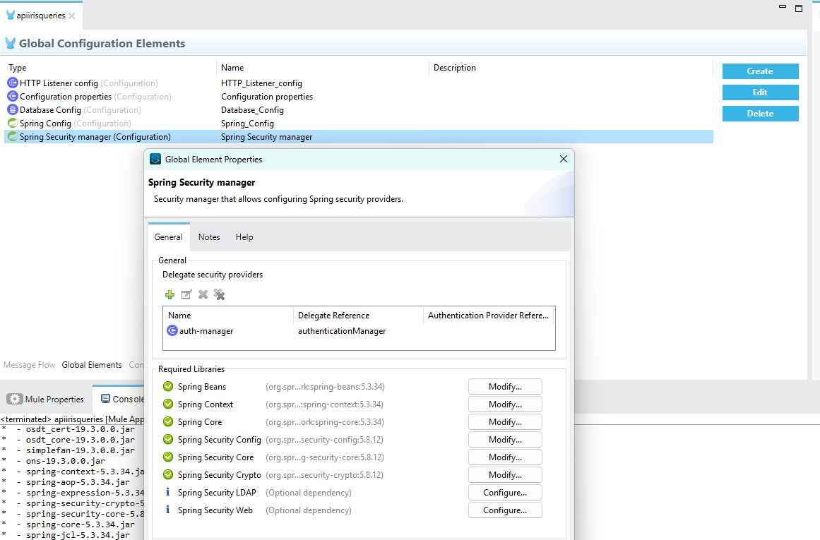 <spring:config name="Spring_Config" doc:name="Spring Config" doc:id="zzzzzz" files="beans.xml" /> <spring:security-manager doc:name="Spring Security manager" doc:id="xxxxxxxxx"> <spring:delegate-security-providers> <spring:delegate-security-provider name="auth-manager" delegate-ref="authenticationManager" /> </spring:delegate-security-providers> </spring:security-manager> - Alla fine di questa procedura i Global Elements del progetto dovrebbero comparire come in questo screenshot con un auth-manager annidato nello Spring Security Manager.