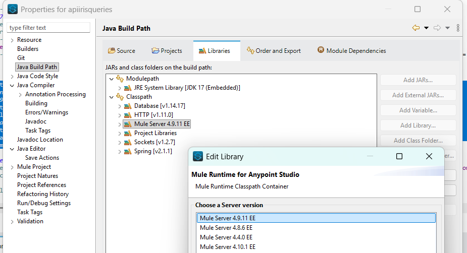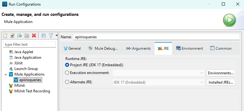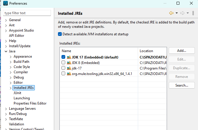 - In Anypoint Studio: Aggiunta di jdk 17 in Window->Preferences->Java->Installed JREs.