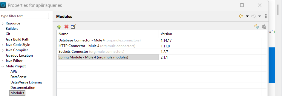 - Aggiornare tutti i moduli: tasto destro sul nome del progetto->Properties->Mule Project->Modules. Tutti i moduli sono stati messi all’ultima versione, in particolare lo Spring Module è stato aggiornato alla versione 2.1.1.