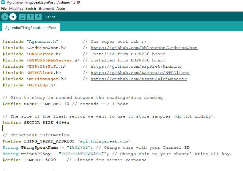 2. Modifica, compilazione e caricamento dello sketch su Agrumino.