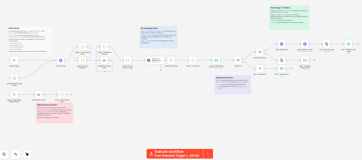 Nel progetto wp-social-publisher-with-n8n [3] ho realizzato un workflow che fa esattamente quello che facevo a mano, ma in modo automatico e coerente.